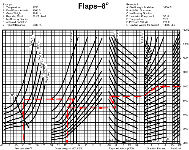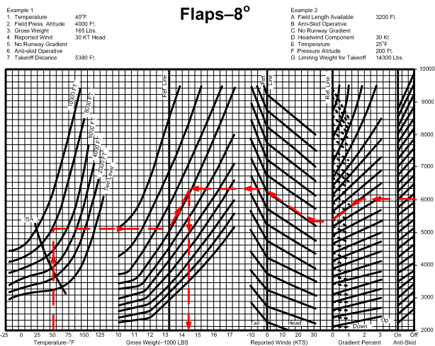 Note that this graph has reference lines, from which you move “up or down” or “left or right,” depending on the takeoff conditions. So, from the intercept of Pressure Altitude and Temperature, you migrate to the right to the Gross Weight Reference Line; if the aircraft gross weight is less than 13000 lbs. you must fall off to the lower left and if over 13000 lbs. you travel up and to the right (parallel to the Gross Weight curved lines), and continue until you intercept the actual Gross Weight lines (vertical). Then, from the Gross Weight intercept, you move to the Wind Reference Line—from here you use the same technique. Note with respect to the Gradient Percentage Reference Line you either move up parallel to the solid lines (in the event of a down-slope runway surface) or down parallel to the broken lines (in the event of a up-slope runway).6 From the Gradient Percentage intercept you move parallel directly to the far-right Takeoff Distance number—but only if the Anti-skid system is functioning—“On”—during the takeoff. Alternatively, if Anti-skid is Off then you must stop at the first line, and then proceed upward and to the right to read the increased takeoff distance.7
