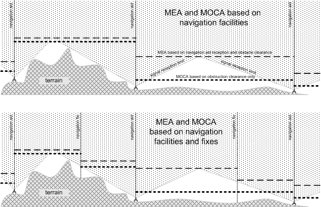 In contrast, the MEA provides an altitude above sea level between specified fixes on airways or air routes that assures acceptable navigational coverage, and which meets the IFR obstruction clearance requirements.2 Accordingly, MEA will always be higher than MOCA.