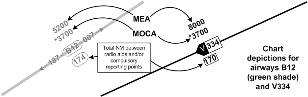 Also note that VHF/UHF airways are depicted in black ink, while LF/MF airways are in green. You will not have difficulty determining the proper odd/even altitude to fly as the even altitude direction associated with an airway is indicated by the pointed end of the airway identification box.