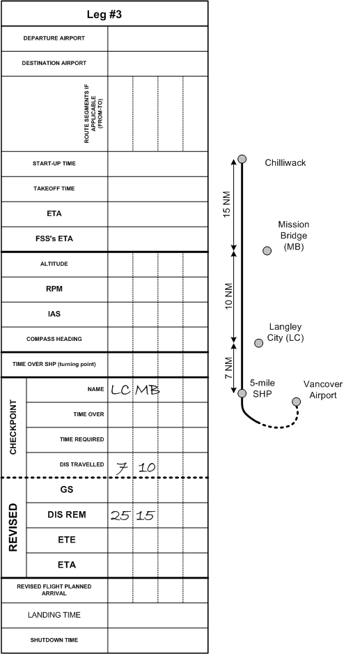 A similar arrangement is made for a leg with two checkpoints. In the following example, the flight is from Vancouver International (CYVR) to Chilliwack, with checkpoints at Langley City and Mission Bridge. We shall say that the total distance is 45 NM, that the SHP is 5 NM out of Vancouver Airport, that the distance from the SHP to Langley City is 7 NM, the distance from Langley City to Mission Bridge is 10 NM, and the distance from Mission Bridge to Chilliwack is 15 NM: