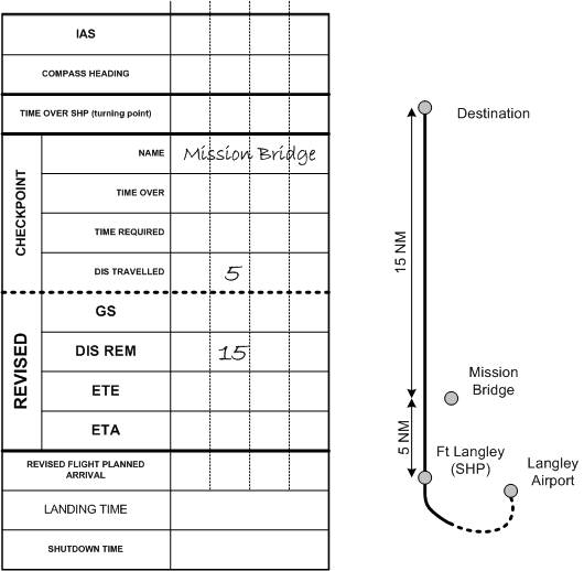 Prepare your checkpoint information using the first page of the navigation sheets, noting for each leg the name of the checkpoint, the distance travelled, and the distance remaining. Here is an example for a flight from Langley (CYVR) to Chilliwack (CYCW) with Ft. Langley as the SHP and Mission Bridge as the Checkpoint. The distance from Ft. Langley to the Mission Bridge we shall say is 5 NM, and the distance from Mission Bridge to Chilliwack is 15 NM: