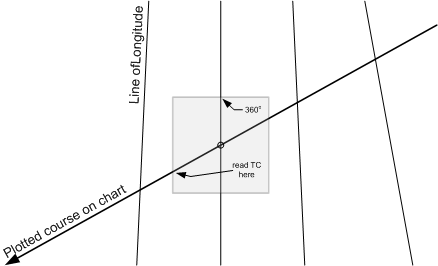 The true course is determined from the chart using a Douglas Protractor. Find a line of longitude that is closest to the centre of each leg segment. Align the Douglas Protractor so that the 360°-marker (at the top of the Douglas Protractor)—or one of the etched vertical parallel lines—lies squarely on the longitude, and the centre grommet of the Douglas Protractor lies along the track line. Read the true course on the Douglas Protractor scale (located on the edge) where the track line passes—make sure you read the side in the direction of flight.