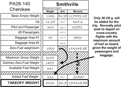 It is quite likely that the payload for the trip, including passengers and baggage, is known. Weight and balance can therefore be organized—see the fourth page of the navigation sheets, which includes provision for a zero-fuel weight calculation. The zero-fuel weight allows the pilot to determine the maximum amount of fuel that can be loaded given the payload weight. Here is an example: