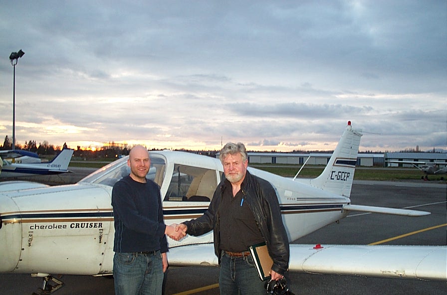 Carl Tingstad receives congratulations from his Flight Instructor, Rod Giesbrecht, after the successful completion of Carl's Private Pilot Flight Test.  Langley Flying School.