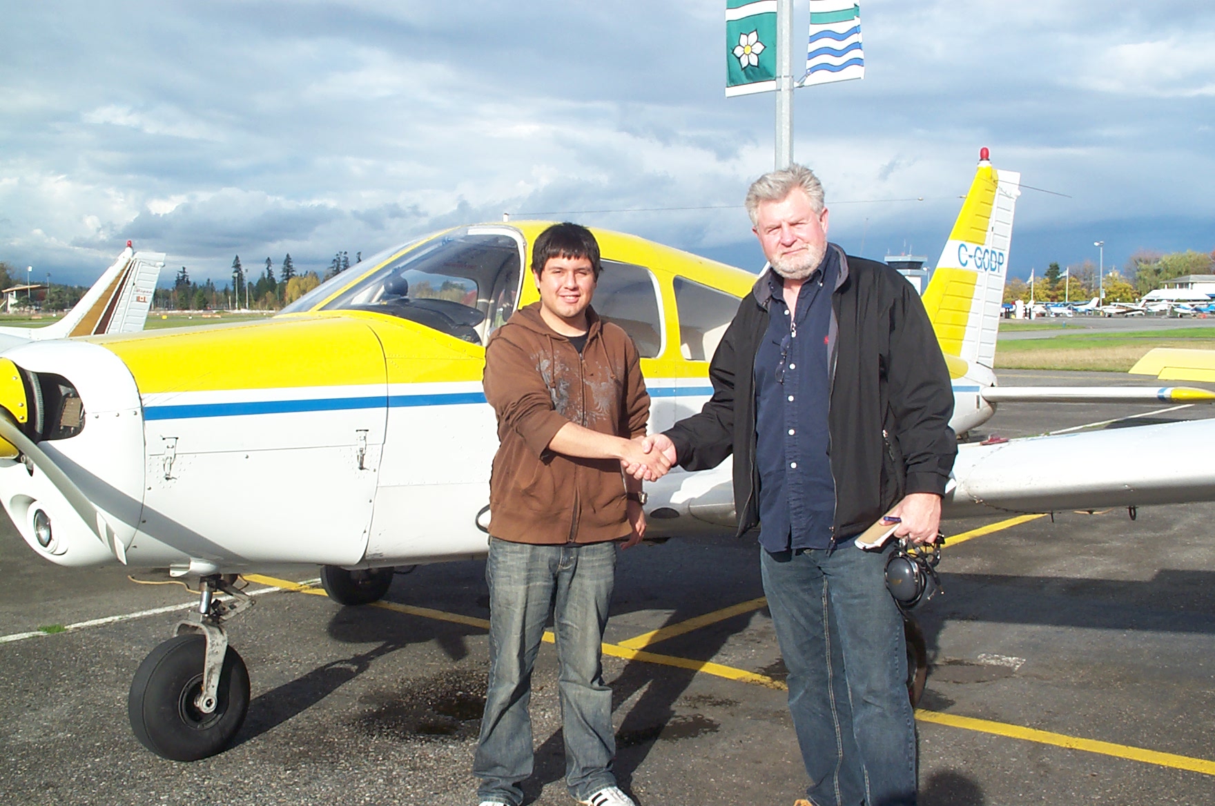 Carlos is congratulated by Pilot Examiner Paul Harris.