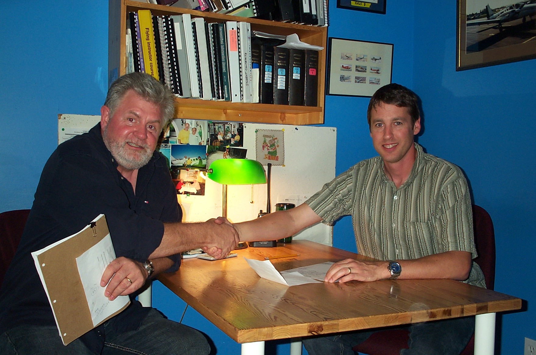 Dean Bicknell receives congratulations from Pilot Examiner Paul Harris after the successful completion of Dean Private Pilot Flight Test.  Langley Flying School.