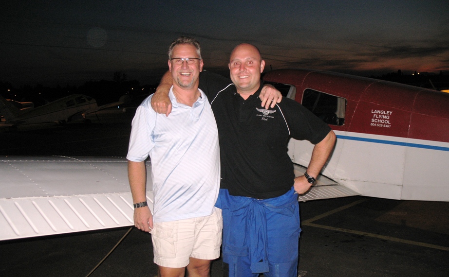Kevin Mickelby with his Flight Instructor Rod Giesbrecht (above) after the successful completion of Kevin's Private Pilot Flight. Test on July 15, 2009, and with Pilot Examiner Paul Harris (left).
