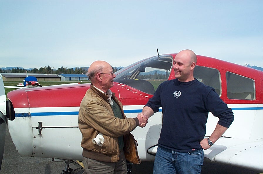 Rod Giesbrecht receives congratulations from Pilot Examiner Donn Richardson after the completion of his Commercial Pilot Flight Test on March 28, 2007. Congratulations also to Rod's Flight Instructor Cullen Worth.