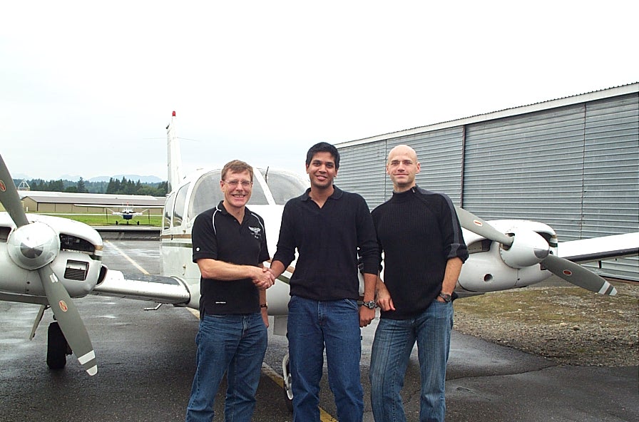 Sagar Canakapalli receives congratulations from Pilot Examiner Todd Pezer after the successful completion of Sagar's Group 1 (Multi-engine) Instrument Rating Flight Test on September 24, 2008. Congratulations also to Sagar's IFR Instructor, Darren Ferguson.