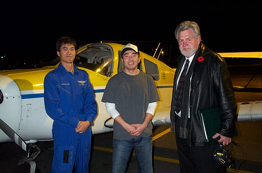 Si-wan (Sean) Yoo with his Flight Instructor, Hoowan Nam, and Pilot Examiner Paul Harris, after the successful completion of Sean's Commercial Pilot Flight Test on November 4, 2009.