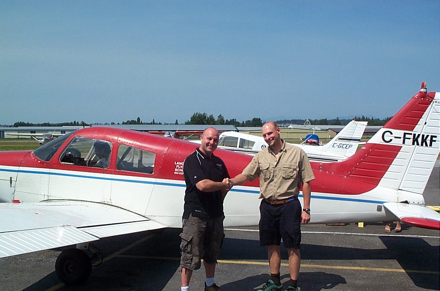 Ville (Will) Tuokkola receives congratulations from his Flight Instructor, Rod Giesbrecht, after the successful completion of Will's Private Pilot Flight Test on August 3, 2009 with Pilot Examiner Paul Harris.