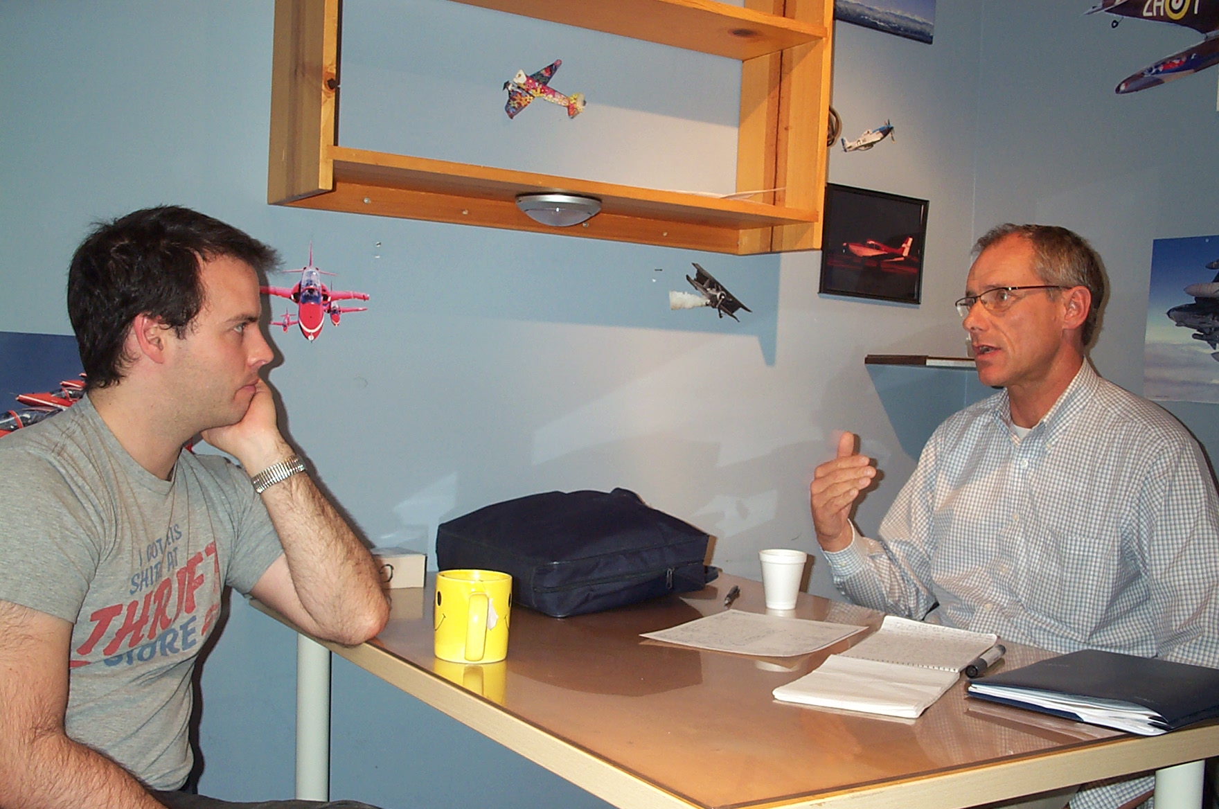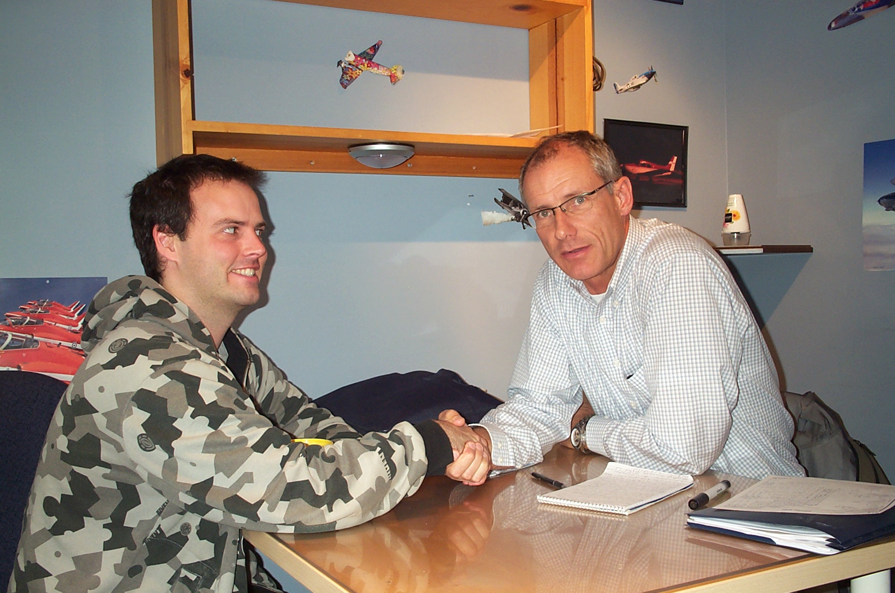 Commercial Pilot Graduate Zenon Garnett is briefed by Pilot Examiner Matt Edwards after the successful completion of Zen's Flight Test for his Group 1 (Multi-engine) Instrument Rating on October 27, 2010.
