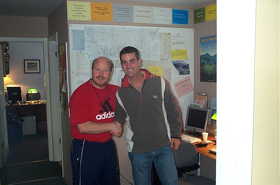 Captain Glenn Gorrie with Dave Parry in December, 2006. Glen flys the Twin Otter with Windward Islands Airways—Winair—based located in the Netherlands Antilles. Glen began flying with Langley Flying School in 1998, completing his Private Pilot Licence in June of 1999, his Multi-engine Class Rating in April of 2000, his Group 1 (Multi-engine) Instrument Rating in February of 2001, and his Commercial Pilot Licence in March of 2002.