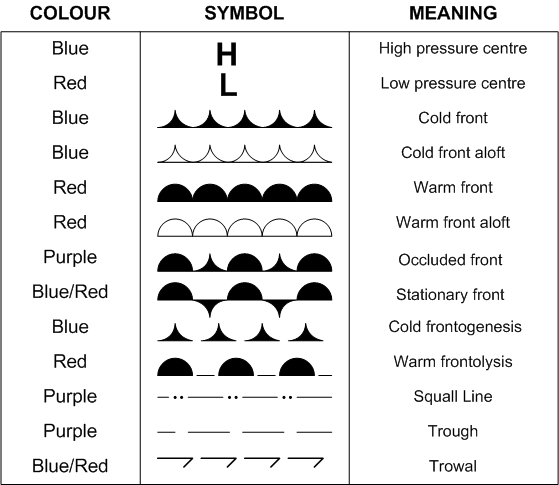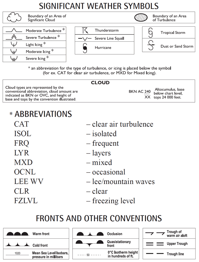Clearly, the ability to decipher the symbols used in weather charts is important, and while the symbols may initially appear to you as Greek, they will with experience become rather straightforward. Here, then, are the symbols and meanings that can be expected on a GFA: